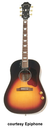 JOHN LENNON AJ/EJ-160 E (MODEL EEEJ) | - dreadnought style, bound body/fingerboard, trapezoid fingerboard inlay, built-in pickup, volume/tone controls (on top), tortoiseshell pickguard, screened "John Lennon" signature on body, available in Natural (1997-98) or Vintage Cherry Sunburst finish, mfg. 1997-present. |