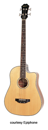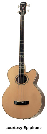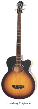 EPIPHONE | ACOUSTIC ELECTRIC BASS | | EL CAPITAN (MODEL EBEC) | - jumbo style, maple body, set-in maple neck, 34 in. scale, rosewood fingerboard with dot inlay, piezo bridge pickup, Para-EQ preamp system, available in Ebony, Natural, or Vintage Sunburst finishes, disc. 2000. |