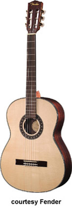 FENDER | ACOUSTIC: CLASSICAL CG SERIES | CG stands for classical guitars (with nylon strings), and they are built in Asia. | CG-5 (NO. 094-0500) | - classical style, nato top/back/sides, round soundhole, nato neck, 12/18-fret rosewood fingerboard, slotted headstock, three-per-side chrome tuners, available in Satin finish, mfg. 1995-98. |