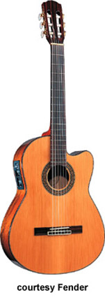 CG-24 SCE (NO. 094-2405) | - classical body with cutaway, solid cedar top, ovangkol back and sides, Nato neck, rosewood fingerboard, wood mosaic rosette, multi-ABS body binding, brown neck binding, 18 frets, gold tuners, Fender Piezo Transducer pickup with Onboard Active Preamp, three-band EQ plus Mid Sweep, available in Natural finish, 25.3 in. scale, mfg. summer 1999-2005. |