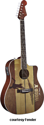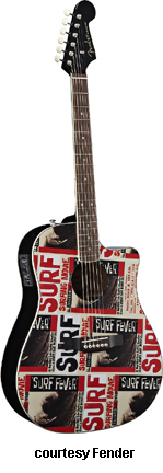JOHN SEVERSON SURF FEVER/WOODY SONORAN SCE (NO. 096-8040/8042) | - single cutaway dreadnought-style body, solid spruce top, laminated mahogany back and sides, top and back binding, round soundhole, vintage C-shaped maple neck, 14/20-fret rosewood fingerboard with white dot inlays, Stratocaster-style headstock, six-per-side chrome tuners with white plastic buttons, rosewood bridge, available in Surf Fever (Black/Red/White graphics top with black back, sides, and headstock overlay) or Woody (Woody graphics on top with Natural back, sides, and headstock overlay) finish, 25.3 in. scale, mfg. late 2008-present. |