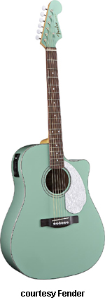 MAILBU CE FOURTH VERSION (NO. 096-8008) | - single cutaway folk-style body, spruce top, laminated mahogany back and sides, top and back binding, round soundhole with checkered rosette, maple vintage C-shaped neck, 14/20-fret bound rosewood fingerboard with pearl dot inlays, Stratocaster-style headstock with six-on-one-side chrome tuners with aged white plastic buttons, rosewood bridge, gold pickguard, Fender FTE3-TN electronics, available in Natural finish, 24.75 in. scale, new 2009. |
