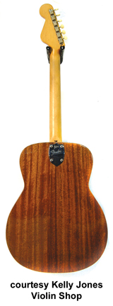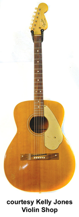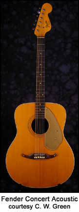 FENDER | ACOUSTIC: 1963-1970 PRODUCTION MODELS | Before Fender introduced their full line of acoustic guitars designed by Roger Rossmeisl in 1963, they also sold a few Fender-branded guitars that were built by Harmony. | CONCERT | - dreadnought style, spruce top, round soundhole, maple back/sides, bound top/back, bolt-on maple neck with neckplate, 20-fret rosewood fingerboard with pearl dot inlays, six-per-side chrome tuners, rosewood bridge with white bridgepins, single-ply pickguard, aluminum support rod (through body), available in Natural finish, 15.375 in. body width, 25.5 in. scale, mfg. 1963-1970. |