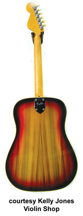 PALOMINO | dreadnought style, spruce top, mahogany back and sides, round soundhole with two rope pattern and two black rings, top and back binding, maple neck, 14/20-fret rosewood fingerboard with dot inlays, Strat-style headstock with maple overlay, six-on-one-side tuners with plastic buttons, rosewood bridge, 15.375 in. body width, 25.5 in. scale, available in Black Vermillion, Natural, or Sunburst finish, mfg. 1968-1971. |