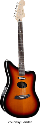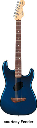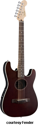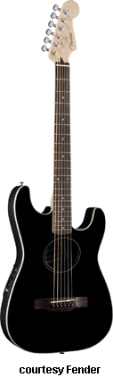 STANDARD STRATACOUSTIC (NO. 096-7300) | - acoustic Stratocaster-style body, laminated spruce top, one-piece fiberglass back and sides, X bracing, oval soundhole, C-shaped maple neck, 21-fret rosewood fingerboard with dot inlays, Strat-style headstock with six-on-one side chrome tuners, rosewood bridge, BG3-TN electronics with volume, bass, mid, and treble controls and a built-in tuner, available in Black or Walnut Stain finish, 25.5 in. scale, made in South Korea, new 2009. |
