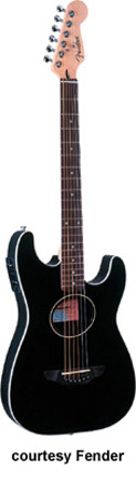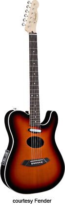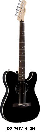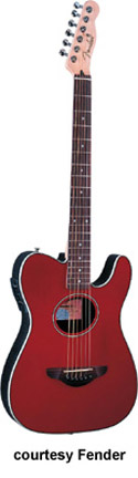 TELECOUSTIC (NO. 095-7500) | - solid spruce top, single cutaway, state-of-the-art one-piece fiberglass body, bolt-on neck with rosewood fingerboard, dot position markers, thinline body, trademark Telecaster headstock design, die-cast tuners, Fender Fishman Classic 4 Preamp, available in Inca Silver, Sunburst (2002-05), Natural (2002-05), or Candy Apple Red finish, mfg. 2000-05. |