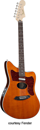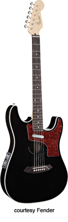 STRATACOUSTIC DELUXE (NO. 096-7400) | - acoustic Stratocaster-style body, spruce top, solid mahogany back, laminated mahogany sides, oval soundhole, maple Stratocaster neck, 21-fret rosewood fingerboard with dot inlays, Strat-style headstock with six-on-one side tuners, rosewood bridge, interchangeable black, white, and tortoiseshell pickguards, single exposed Telecaster pickup, Fishman Classic IV MB electronics, chrome hardware, available in Black or Sunburst finish, 25.5 in. scale, made in South Korea, mfg. 2007-present. |