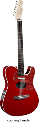 TELECOUSTIC DELUXE (NO. 096-7500) | - acoustic Telecaster-style body, spruce top, solid mahogany back, laminated mahogany sides, oval soundhole, maple Telecaster neck, 21-fret rosewood fingerboard with dot inlays, Telecaster-style headstock with six-on-one side tuners, rosewood bridge, interchangeable black, white, and tortoiseshell pickguards, single exposed Telecaster pickup, Fishman Classic IV MB electronics, chrome hardware, available in Candy Apple Red or Sunburst finish, 25.5 in. scale, made in South Korea, mfg. 2007-present. |