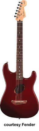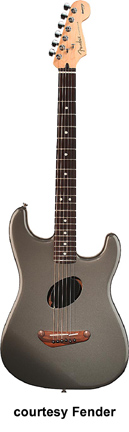 ACOUSTASONIC STRATOCASTER (MEX. MFG. NO. 013-9700) | - alder hollow body, oval oblong soundhole, maple M-Shaped neck, 22-fret rosewood fingerboard with dot inlay, six-on-one-side tuners, rosewood bridge, three in-bridge Piezo pickups, no pickguard, three knobs, chrome hardware, available in Crimson Red Trans., Ebony Trans., Pewter, or Sapphire Blue Trans., finish, mfg. 2004-present. |