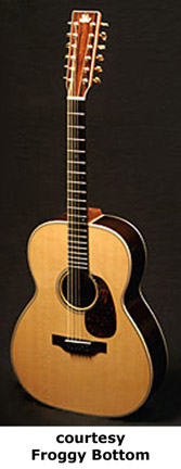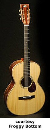 FROGGY BOTTOM GUITARS | Instruments currently built in Newfane, VT since 1970. Distributed by Froggy Bottom Guitars. | Luthier Michael Millard visited Michael Gurian's workshop in 1970 and was offered a job after his college graduate program was eliminated. Millard built his first Froggy Bottom guitar (a modified Gurian JM) in his apartment's kitchen in late 1970. In 1973, Millard moved with Gurian to New Hampshire and continued to work for him until 1974 when he left to start building his own guitars exclusively. Millard continued building Froggy Bottom guitars one at a time through the rest of the 1970s and most of the 1980s. As his guitars became more popular and widespread, demand started to pour in from guitar stores and dealerships. By the mid-1980s, Millard started attending NAMM shows, began developing a dealer network, and started selling guitars wholesale for the first time. Froggy Bottom is now the trio of Andy Mueller, Eric Goodenough and Millard, enhanced by the unique engraving skills of long-time collaborator Petria Mitchell. In 2008, the company moved to a new, off-the-grid post and beam workshop in central Vermont and produces about one hundred high-end acoustic guitars annually. These instruments have won an Acoustic Guitar Magazine "Players Choice Award" in each of the years that poll has been conducted. Froggy Bottom is somewhat unusual in that they refuse to use their high-profile clients in their advertising, instead they prefer to deal with the functional needs of players directly and personally. For more information, visit Froggy Bottom's website or contact them directly (see Trademark Index). | | ACOUSTIC |