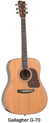 GALLAGHER GUITARS | ACOUSTIC | All Gallagher guitars are meticulously handcrafted, using the finest woods available at the workshop. Hardshell cases are an extra charge, at $150 for a standard hardshell case or $575 for a Calton case, which is custom made for Gallagher instruments. The first Gallagher guitar model was built back in 1965, and was designated the G-50 in honor of J.W. Gallagher's age at the time. In 1968, both Doc and Merle Watson began playing guitars crafted by J.W. and Don. In 1974, Doc Watson requested particular features in a guitar that was built for him, and it was the basis for the Doc Watson model. In 1975, Merle recieved the first cutaway version of this model. The first GC-70 was built in 1968, for country artist Grandpa Jones. The 71 Special was introduced in 1970. The 72 Special was introduced in late 1977. Price options apply to guitars where the feature is not part of the standard package (i.e. the Steve Kaufman comes standard with Sunburst finish so you would not add $275). | 71 SPECIAL | - dreadnought style, rosewood back/sides/neck, Sitka spruce top with voiced bracing, maple B/N/H binding, round soundhole withherringbone purfling and inlay, 14/20-fret ebony fingerboard withabalone snowflakeinlays, MOP bell flower headstock inlay, three-per-side tuners, ebony bridge, chrome hardware, Natural finish, mfg. 1970-present. |