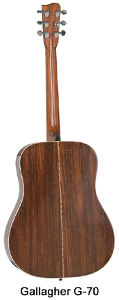 G-70/A-70/GC-70/GA-70 | - auditorium, dreadnought, grand auditorium,or grand concert style, rosewood back/sides/neck, Sitka spruce top, ivoroid body binding, round soundhole withherringbone purfling and inlay, 14/20-fret ebony fingerboard with MOPdiamond andsquareinlays, ivoroid-bound headstock, three-per-side tuners, ebony bridge, tortoiseshell pickguard, chrome hardware, Natural finish, current mfg. |