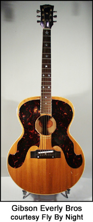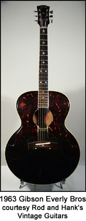 GIBSON | ACOUSTIC: EVERLY BROTHERS SERIES | | EVERLY BROTHERS | - spruce top, round soundhole, two tortoiseshell pickguards, two-stripe bound body/rosette, maple back/sides, one-piece mahogany neck, 14/20-fret rosewood fingerboard with pearl star inlay, reverse belly adjustable bridge with pearl dot inlay, blackface peghead with pearl star/logo inlay, three-per-side gold tuners, available in Black, Cherry Sunburst, Natural top/Red back/sides, or Natural top/Walnut back/sides (rare, approx. 45 mfg. 1963 only) finishes, approx. 440 mfg. 1962-1971. |