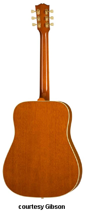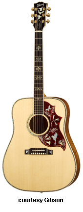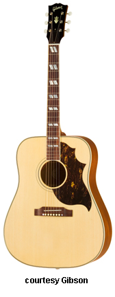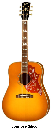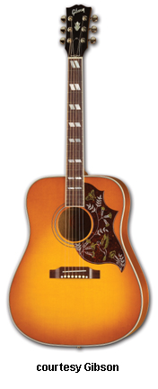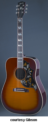 HISTORIC HUMMINGBIRD (MODEL SSHB) | - square shoulder dreadnought body, premium Sitka spruce, mahogany back/sides, mahogany neck, rosewood fingerboard with mother-of-pearl paralellogram inlays, 24 3/4 in. scale, mother-of-pearl crown in headstock, traditional Gibson rosewood bridge with mother-of-pearl inlays, nickel Grover kidney tuners, active preamp pickups, Heritage Cherry Sunburst finish. 250 mfg. beginning 2005. |