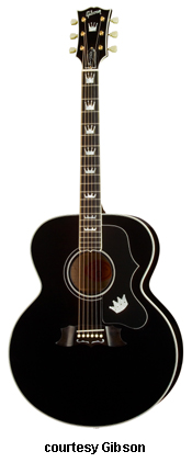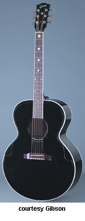 J-180 (RECENT MFG.) | - solid Sitka spruce top, round soundhole, white body binding, maple back/sides, 14/20-fret bound rosewood fingerboard with mother-of-pearl star inlays, rosewood bridge, white bridgepins, blackface peghead with abalone star/logo inlay, three-per-side nickel tuners, "dual side" black pickguard, available in Ebony finish, disc. 2005. |