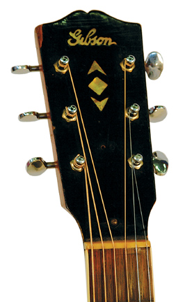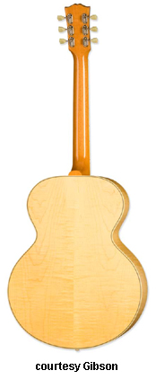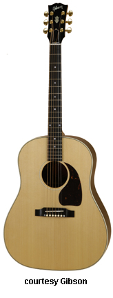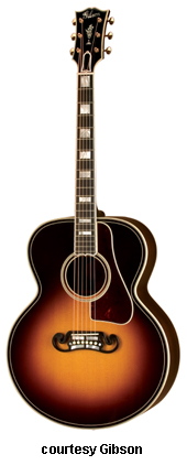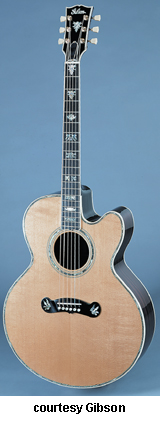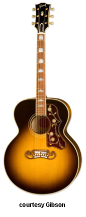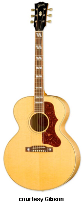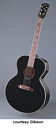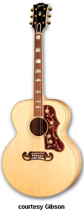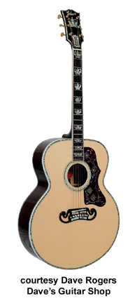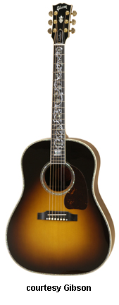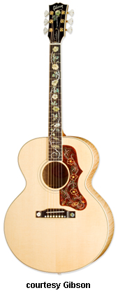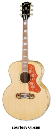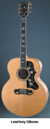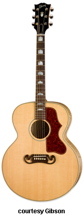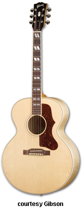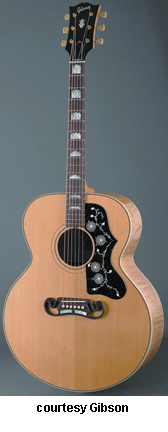 J-200/SJ-200 | - spruce top, round soundhole, black pickguard with engraved floral pattern, figured maple back/sides/neck, 14/20-fret bound rosewood fingerboard with pearl crown inlay, rosewood mustache bridge with pearl block inlay, black pearl dot pins, bound peghead with pearl plant/logo inlay, three-per-side gold tuners with pearl buttons. Available in Antique Walnut, Natural, or Vintage Sunburst finishes, mfg. 1938-1942, and 1945-1996. |