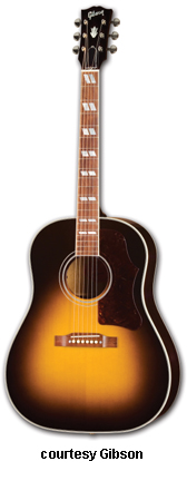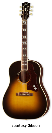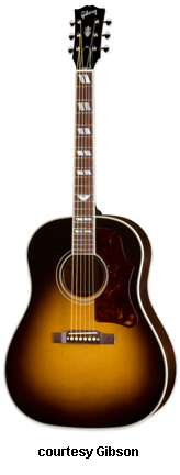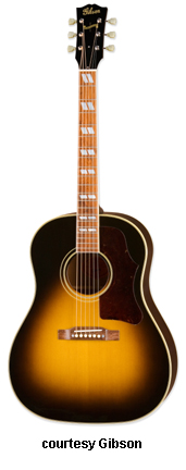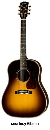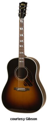 SOUTHERN JUMBO TRUE VINTAGE | - detailed edition of Gibson's late 1940s SJ, rounded-shouldered style, solid Sitka spruce top, solid mahogany back and sides, round soundhole with rosette, six-ply top binding, four-ply back binding, mahogany V-shaped neck, 14/20-fret Madagascar rosewood single-ply bound fingerboard with MOP split parallelogram inlays, black headstock with MOP logo, three-per-side nickel Gotoh tuners with white buttons, Madagascar rosewood bridge with MOP dots and white pins, tortoiseshell SJ pickguard, available in Vintage Sunburst finish, 24.75 in. scale, mfg. 2007-08. |
