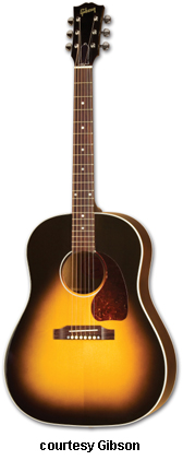 1942 J-45 (MODEL H442) | - detailed edition of a 1942 Gibson J-45, rounded-shouldered dreadnought style, solid Adirondac spruce top, solid mahogany back and sides, round soundhole with rosette, five-ply top binding, three-ply back binding, mahogany 1942 profile neck, 14/20-fret Madagascar rosewood fingerboard with MOP dot inlays, black headstock with script Gibson logo and banner, three-per-side reporduction nickel tuners with white buttons, Madagascar rosewood bridge with MOP dots and white pins, 1942 style celluloid teardrop pickguard, available in Vintage Sunburst finish, 24.75 in. scale, Red Line case included, limited production of 25 guitars per month, mfg. 2007-present. |