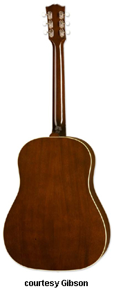 J-45 Dwight Yoakam Honky Tonk Deuce (Model ACDYHT) | - similar to J-45 reissue, except has solid Indian rosewood back/sides and bridge, V profile mahogany neck with double paralellogram inlays and dice at the 12th fret, tortoiseshell J-50 pickguard has mother-of-pearl dice inlays, available in Antique Natural or Vintage Sunburst finish, mfg. 2003-present. |