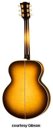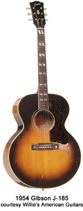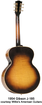 J-185 | - spruce top, round soundhole, tortoise pickguard, two-stripe bound body/rosette, figured maple back/sides, mahogany neck, 14/20-fret rosewood fingerboard with pearl parallelogram inlay, upper belly rosewood bridge with white pins, pearl cross bridge wings inlay, blackface peghead with pearl crown/logo inlay, three-per-side nickel tuners, available in Cremona Brown Burst (most common) or Natural finishes, mfg. 1951-59. |