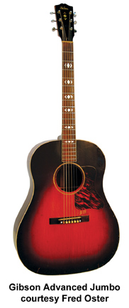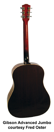 ADVANCED JUMBO (MFG. 1936-1940) | - similar to jumbo, 16 in. wide, 20.25 in. long, and 4.5 in. deep, rosewood back/sides, pearl diamond/arrow fingerboard inlay, white black dot bridge pins, pearl diamond/arrow peghead inlay, available in Sunburst finish, approx. 300 mfg. 1936-1940. |