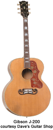 J-200 Pre-War Western Classic (Model SJ2C) | - Indian rosewood back/sides, maple neck with ebony bridge and fingerboard with mother-of-pearl block inlays, patterned after the 1937 Ray Whitley model, available in Vintage Sunburst finish, Custom Shop model, mfg. 1999-present. |