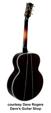 J-200 Deluxe | - spruce top, round soundhole, black pickguard with engraved floral pattern/abalone dot inlay, abalone bound body/rosette, figured maple back/sides/neck, 14/20-fret bound ebony fingerboard with abalone crown inlay, ebony mustache bridge with abalone block inlay/white abalone dot pins, bound blackface peghead with abalone crown/logo inlay, three-per-side gold Grover Imperial tuners, available in Antique Natural or Vintage Sunburst finishes, mfg. 1994-96. |