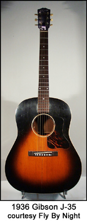 JUMBO 35 (J-35) | - spruce top, round soundhole, bound body, one-ply stripe rosette, mahogany back/sides/neck, 14/19-fret rosewood fingerboard with pearl dot inlay, rosewood straight bridge with pearl dot inlay, white bridge pins, blackface peghead with screened logo, three-per-side tuners with plastic buttons, "tiger stripe" pickguard, available in Natural (approx. 25 mfg. 1941 only) or Sunburst finish, approx. 2,500 mfg. 1936-1942. |