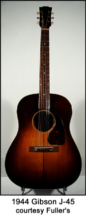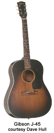 J-45 | - slope shouldered body, spruce top, round soundhole, tortoiseshell pickguard, three-stripe bound body/rosette, mahogany back/sides/neck, 14/19 (pre-war) or 14/20-fret rosewood fingerboard with pearl dot inlay, rosewood bridge with black pins, three-per-side nickel tuners with pearl buttons, available in Sunburst finish, mfg. 1942-1985. |