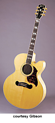 SUPER 200 CUSTOM | - J-200 super jumbo size body with Super 400 appointments, solid Sitka spruce top, figured maple back and sides, ebony bridge and fingerboard, mother-of-pearl split block inlays, Venetian cutaway pickguard with headstock style inlay, available in Antique Natural or Vintage Sunburst finish, Custom Shop model, mfg. 2001-05. |