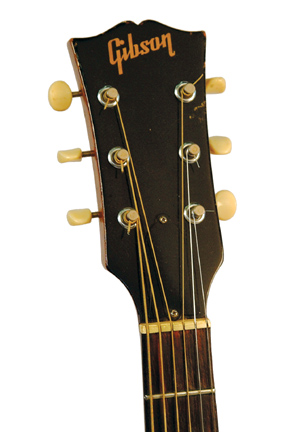 J-100/J-100 CUSTOM (1939-1975 MFG.) | - mahogany neck/back/sides, cedar top, 17 in. wide, black teardrop pickguard, rosewood belly bridge, four-ply top binding with black outer layer, black bound back, 25.5 in. scale, dot inlays, crown peghead inlay, pearl logo, approx. 140 mfg. 1939-1941, and approx. 290 mfg. 1972-1975. |