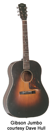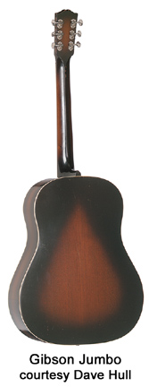 GIBSON | ACOUSTIC: JUMBO, J, & SJ MODELS | | JUMBO | - round soundhole, stripe bound body/rosette, mahogany back/sides/neck, 14/19-fret rosewood fingerboard with pearl dot inlay, rectangular rosewood bridge with white pins, blackface peghead with pearl logo inlay, three-per-side nickel tuners, tortoise pickguard, available in Sunburst finish, mfg. 1934-36. |