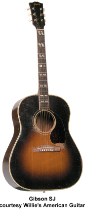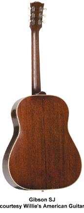SJ (SOUTHERNER JUMBO/COUNTRY WESTERN) | - spruce top, round soundhole, black pickguard, two-stripe bound body/rosette, mahogany back/sides/neck, 14/20-fret bound rosewood fingerboard with pearl parallelogram inlays, rosewood bridge with white pins, blackface peghead with pearl banner logo inlay, three-per-side nickel tuners, available in Sunburst finish, mfg. 1942-1978. |