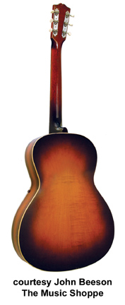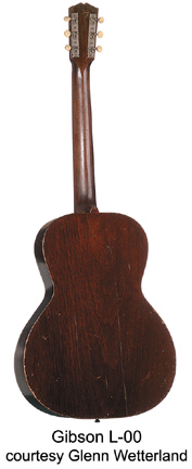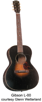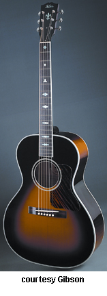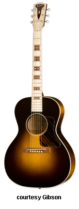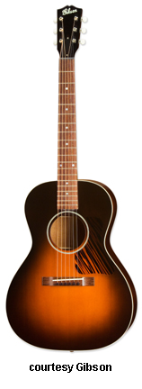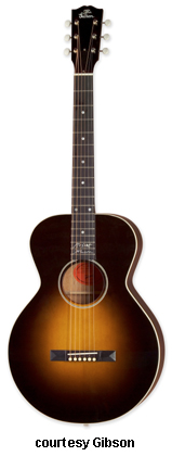 L-00 (1936 REISSUE) | - spruce top, round soundhole, two-stripe bound body/rosette, mahogany back/sides/neck, 14/19-fret bound rosewood fingerboard with pearl dot inlay, rosewood bridge with white pins, three-per-side nickel tuners with plastic buttons. Patterned after Gibson's older 00 size body, available in Antique Walnut, Vintage Sunburst, or Ebony (new 1999) finishes, mfg. 1992-96, reissued 1999-2002. |
