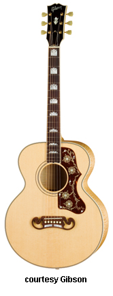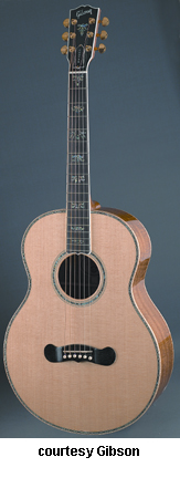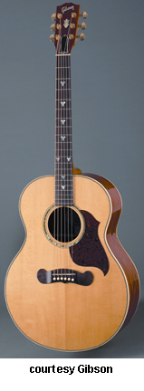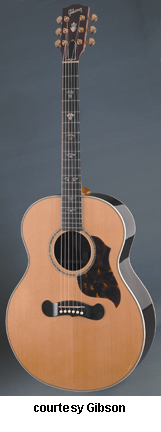 L-200 EMMYLOU HARRIS (MODEL LSL2) | - custom shop model with newly designed body that's smaller and thinner than the SJ-200, new bracing, includes Schertler Bluestick transducer pickup system, SJ-200 features include flame maple back/sides, mother-of-pearl crest fingerboard inlays, moustache bridge, and engraved pickguard, available in Antique Natural or Vintage Sunburst finish, mfg. 2002-present. |