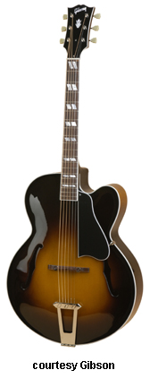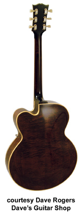 L-5 P (Premiere)/L-5 C | - single rounded cutaway body, arched spruce top, bound f-holes, raised multi-bound pearloid pickguard, multi-bound body, carved figured maple back/sides, figured maple neck, 14/20-fret multi-bound ebony pointed fingerboard with pearl block inlay, adjustable ebony bridge/gold trapeze tailpiece with silver insert, multi-bound blackface peghead with pearl flowerpot/logo inlay, three-per-side gold tuners, available in Natural or Sunburst finishes, mfg. 1939-1989. |