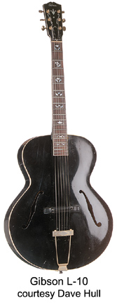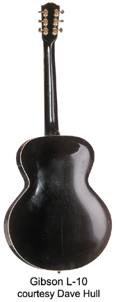 L-10 (1931-39 MFG.) | - 16 or 17 in. body, arched spruce top, f-holes, raised tortoiseshell pickguard, carved maple back/sides, mapleneck, 14/19-fret bound ebony fingerboard with pearl dot inlay, adjustable ebony bridge/wrapover trapeze tailpiece, blackface peghead with pearl logo inlay, three-per-side nickel tuners, available in Black finish, mfg. 1931-39. |