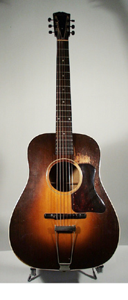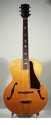 L-47 | - arched spruce top, f-holes, raised bound pickguard, tortoise bound body, maple back/sides, mahogany neck, 14/19-fret ebony fingerboard with pearl dot inlay, adjustable ebony bridge/trapeze tailpiece, blackface peghead with screened logo, three-per-side tuners with plastic buttons, available in Natural or Sunburst finishes, mfg. 1940-43. |