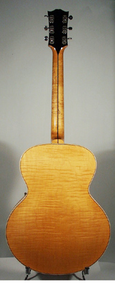 L-5 | - carved spruce top, f-holes, raised multi-bound pickguard, multi-bound body, carved figured maple back/sides, figured maple/ebony neck, 14/20-fret bound ebony pointed fingerboard with pearl dot inlay, adjustable ebony bridge/trapeze tailpiece, multi-bound blackface snakehead peghead with pearl flowerpot/logo inlay, three-per-side silver plate tuners with pearl buttons, Master Model/Lloyd Loar signature labels, available in Natural or Cremona Brown Sunburst finish, limited in mfg. 1922-1958. |