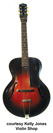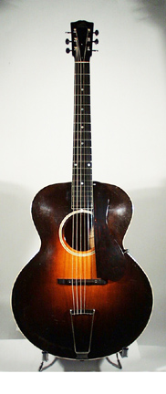 L-75 | - arched spruce top, f-holes, bound body, mahogany back/sides, mahogany neck, 14/19-fret pearloid fingerboard with pearl multi-design inlay in blocks of rosewood, adjustable rosewood bridge/trapeze tailpiece, pearloid veneered peghead, rosewood diamond peghead inlay with pearl logo, three-per-side tuners with plastic buttons, available in Natural or Sunburst finish, mfg. 1932-39. |