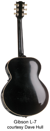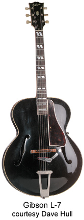 L-7 | - arched spruce top, f-holes, raised bound black pickguard, bound body, carved maple back/sides, mahogany neck, 14/19-fret bound rosewood fingerboard with pearl multi-design inlay, adjustable rosewood bridge/trapeze tailpiece, bound blackface peghead with pearl fleur-de-lis/logo inlay, three-per-side tuners with plastic buttons, available in Natural or Sunburst (most common) finish, 16 or 17 in. body, approx. 1,200 mfg. 1932-1956. |
