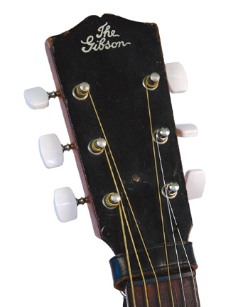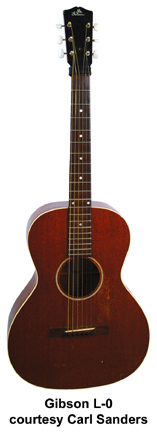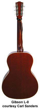 L-0 (1926-1933 MFG.) | - spruce top, round soundhole, bound body, two-stripe rosette, maple back/sides, mahogany neck, 12/19-fret ebonized fingerboard with pearl dot inlay, ebony pyramid bridge with black pins, blackface peghead with screened logo, three-per-side tuners with plastic buttons, available in Amber Brown finish, mfg. 1926-1933. |