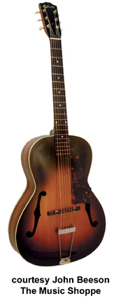 L-30 | - arched spruce top, f-holes, raised black pickguard, bound body, maple back/sides, mahogany neck, 14/19-fret ebony fingerboard with pearl dot inlay, adjustable ebony bridge/trapeze tailpiece, blackface peghead with screened logo, three-per-side tuners with plastic buttons, available in Black finish, mfg. 1935-1943. |