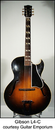 L-4 C | - single pointed cutaway body, arched spruce top, f-holes, raised laminated pickguard, bound body, carved maple back/sides, mahogany neck, 19-fret bound rosewood fingerboard with pearl parallelogram inlay, adjustable rosewood bridge/trapeze tailpiece, blackface peghead with pearl flowerpot/logo inlay, three-per-side tuners with plastic buttons, available in Natural or Sunburst finishes, mfg. 1949-1970. |
