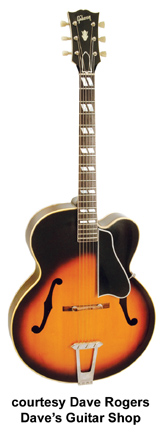 L-7 C | - single rounded cutaway body, arched spruce top, f-holes, raised black laminated pickguard, bound body, carved maple back/sides, mahogany neck, 14/19-fret bound rosewood fingerboard with pearl parallelogram inlay, adjustable rosewood bridge/trapeze tailpiece, bound blackface peghead with pearl crown/logo inlay, three-per-side tuners with plastic buttons, available in Natural or Sunburst (most common) finishes, mfg. 1948-1972. |