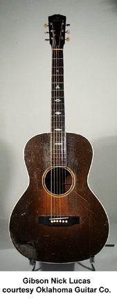 NICK LUCAS (GIBSON SPECIAL) | - slightly arched spruce top, mahogany back/sides/neck, bound body, bound rosewood fingerboard with dot inlay, rosewood bridge, "The Gibson" headstock logo, special round Nick Lucas label, this model underwent redesign several times in its short production span, originally introduced as a mahogany/spruce "Robert Johnson" shaped guitar with at least a 4.5 in. depth and 12 frets to the body, models can be found with 12, 13, and 14 fret-to-the-body fingerboards in mahogany, rosewood, and maple, available in Sunburst finish, original body width was 13.5 in., later mfg. was 14.75 in. wide, 19.25 in. long, 4.5 in. deep, mfg. circa 1928-1941. Limited mfg. (probably less than 250 instruments). |