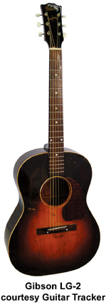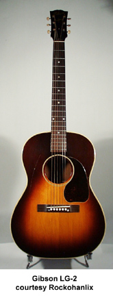 LG-2 | - red spruce top, round soundhole, tortoiseshell pickguard, bound body, one-stripe rosette, mahogany back/sides/neck, 14/19-fret rosewood fingerboard with pearl dot inlay, rosewood straight bridge with pearl dot inlay, black bridge pins, blackface peghead with screened logo, three-per-side nickel tuners with plastic buttons, available in Cherry Sunburst or Golden Sunburst finishes, mfg. 1942-1962. |