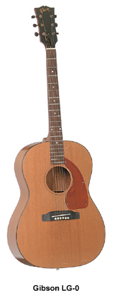 LG-0 | - mahogany top, round soundhole, black pickguard, bound body, one-stripe rosette, mahogany back/sides/neck, 14/20-fret rosewood fingerboard with pearl dot inlay, rosewood straight bridge with pearl dot inlay, white bridge pins, blackface peghead with screened logo, three-per-side nickel tuners with plastic buttons, available in Natural finish, mfg. 1958-1974. |