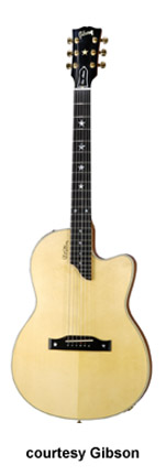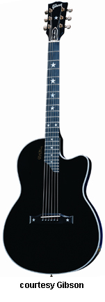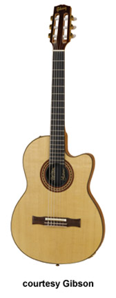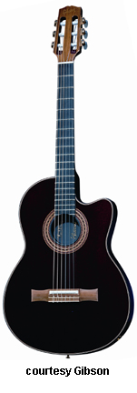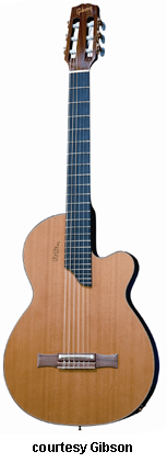 CHET ATKINS CE (ARCE) | - single rounded cutaway mahogany body with hollow sound chambers, solid spruce top, round soundhole with plastic bowl insert, two-stripe bound body, wood inlay rosette, mahogany neck, 19-fret rosewood fingerboard, tied rosewood bridge, rosewood veneer on slotted peghead, three-per-side gold tuners with pearl buttons, Gibson piezo bridge pickups, volume/tone control, active electronics, available in Alpine White (AW), Cedar (CD), Ebony (EB), or Wine Red (WR) finishes, disc. 2002. |