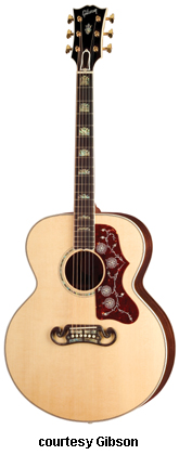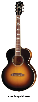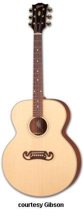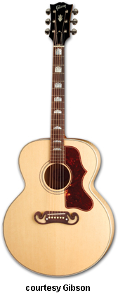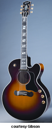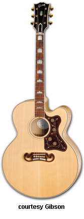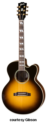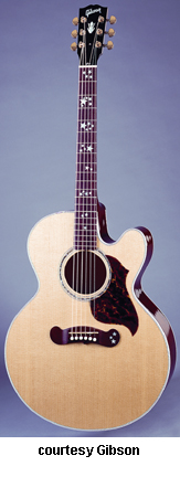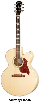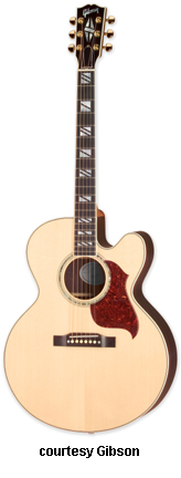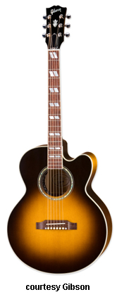 J-180 EC | - solid spruce top, figured maple back/sides/neck, rosewood fingerboard and bridge, mother-of-pearl starburst or dot fingerboard inlays and abalone rosette, with onboard controls, available in Antique Walnut, Vintage Sunburst, or Ebony finish, mfg. 1999-2002. |
